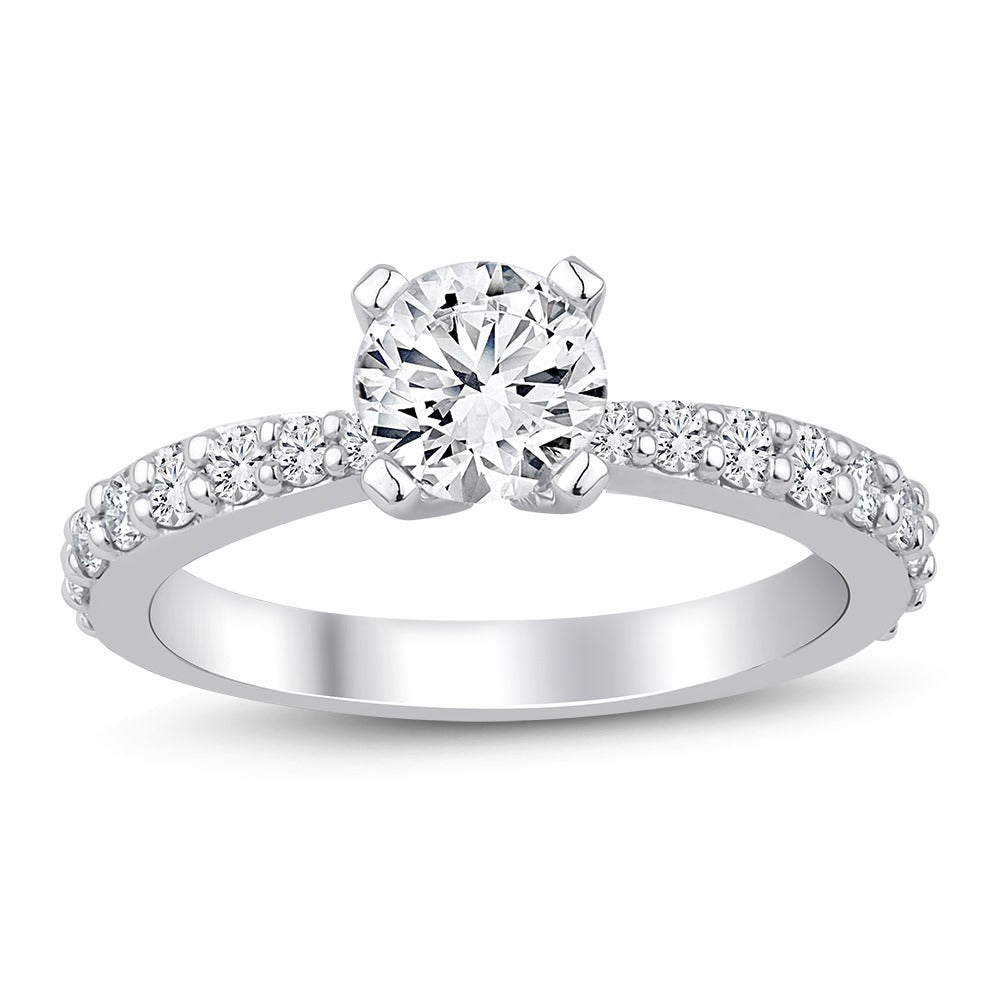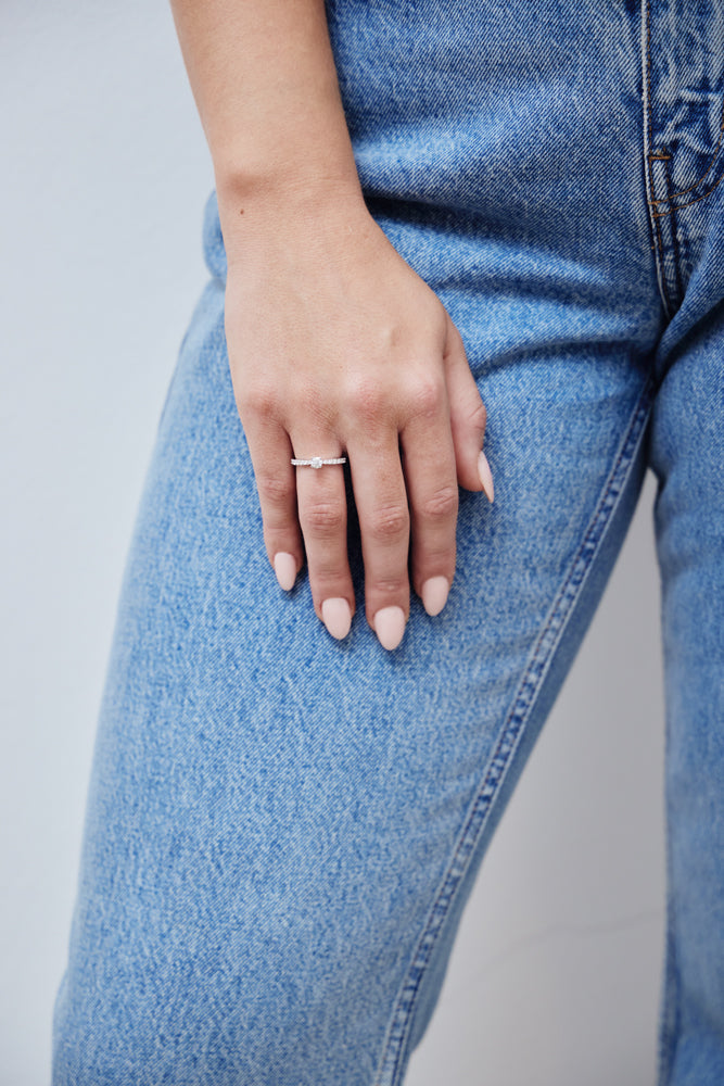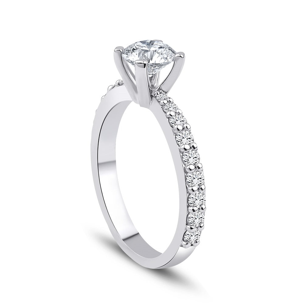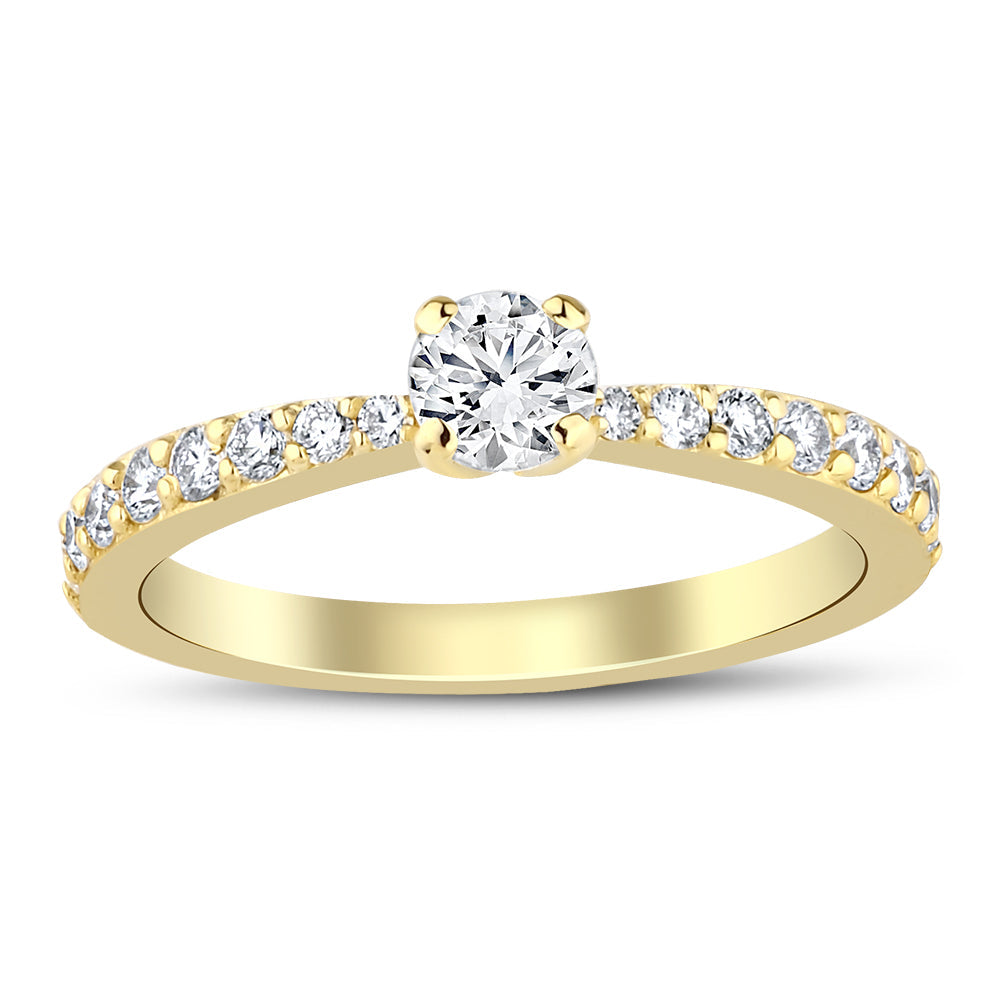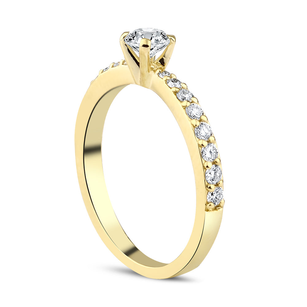 Klassisk solitaire diamantring med diamanter på halvdelen af ringskinnen.
