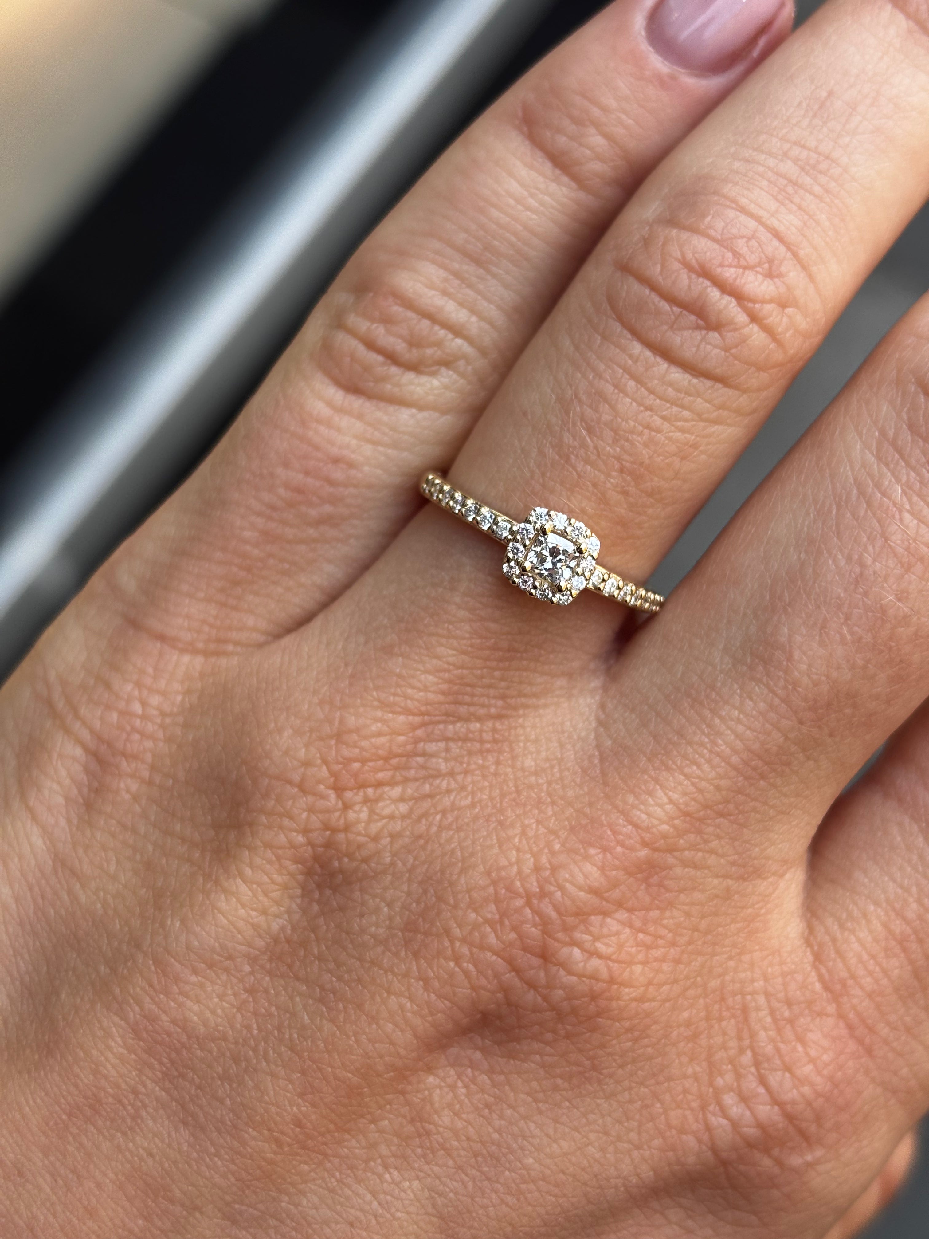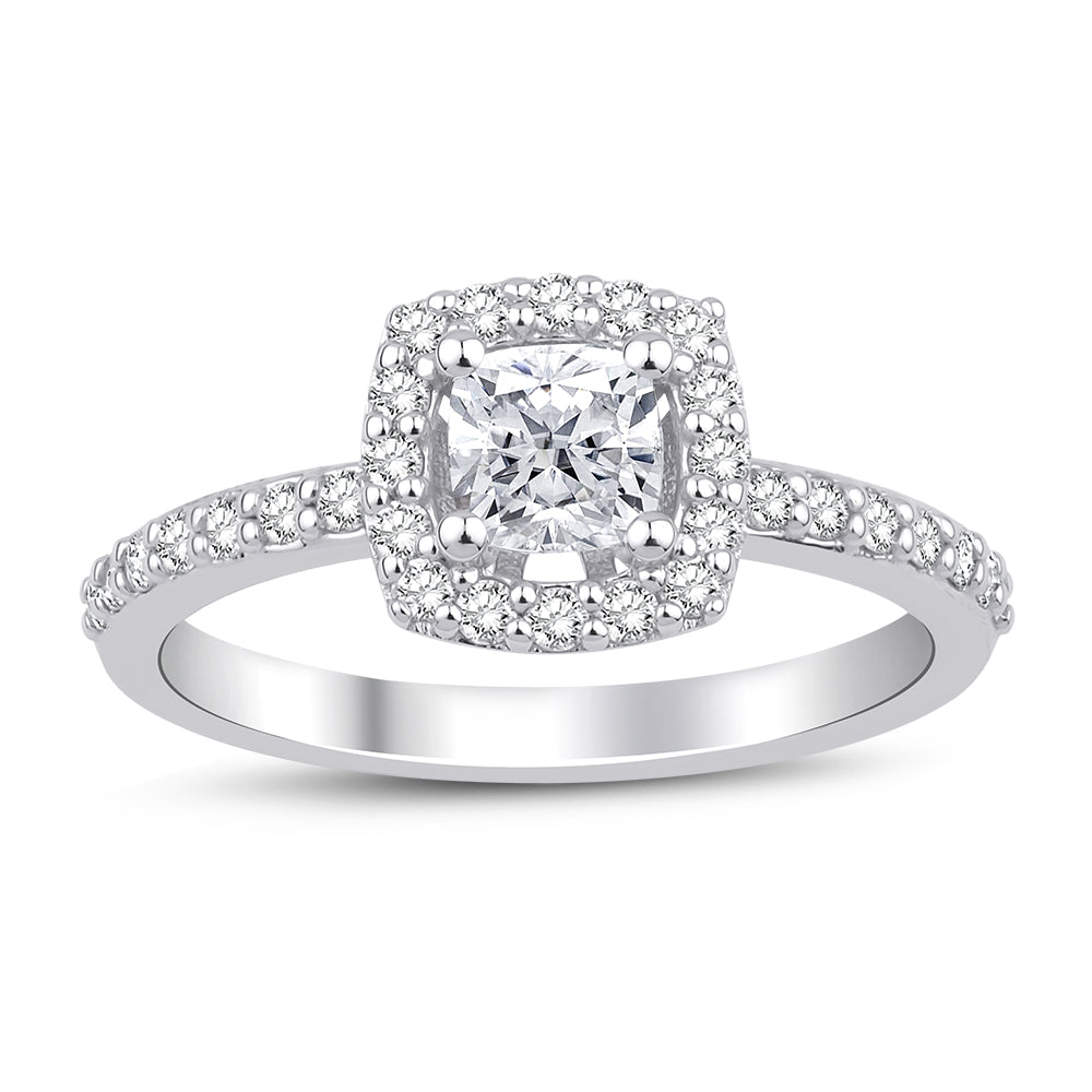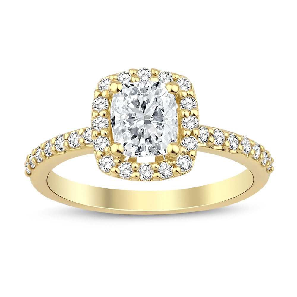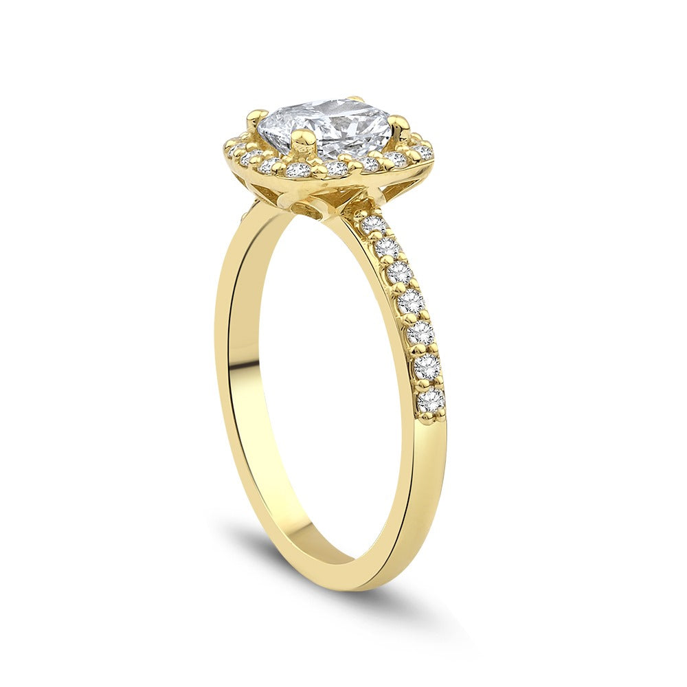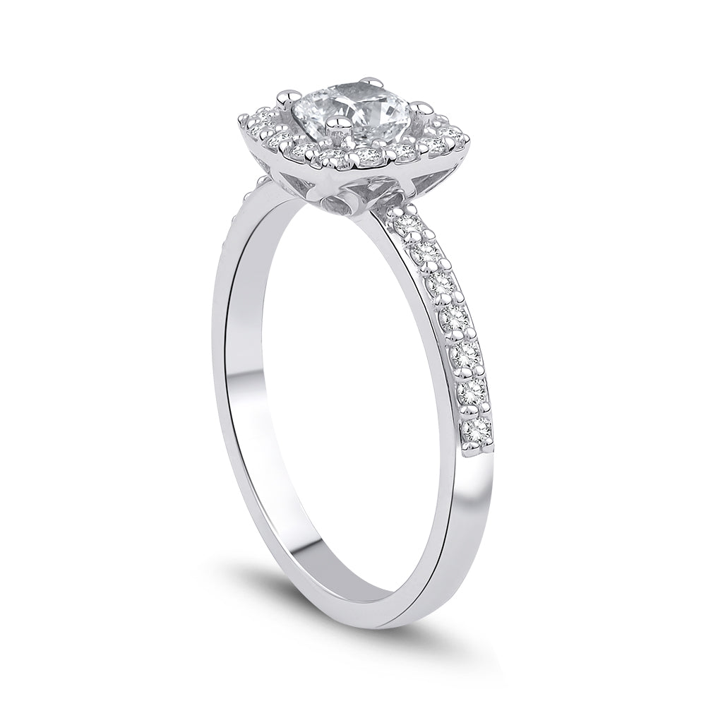 Diamantring med cushion cut centerdiamant, med roset af diamanter og diamanter ned langs ringskinnen.