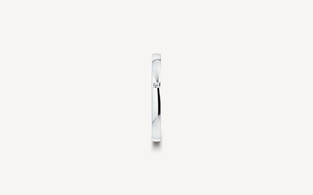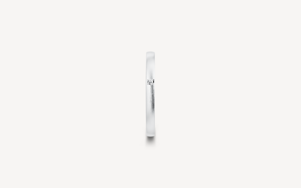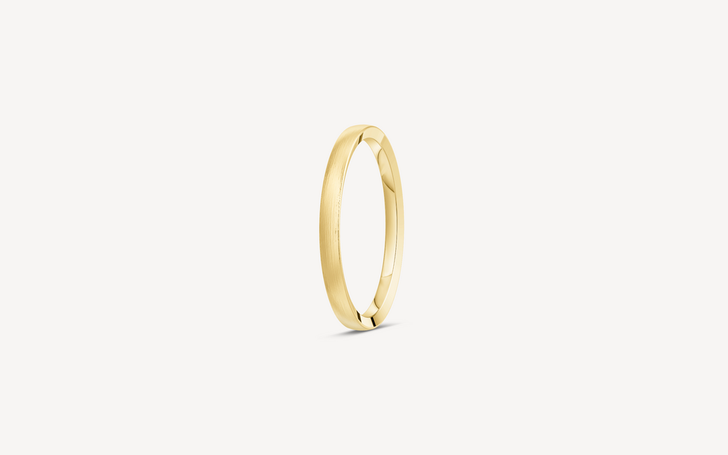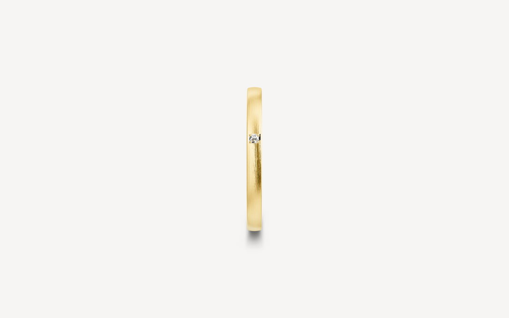 14kt guldring, 2mm bred og 1,4mm høj. Vælg modellen uden sten eller med en enkelt 0.01ct diamant G/SI. D-profilen har et fladt/firkantet design, der ligger behageligt på fingeren. Ringen har en indadgående fræset kant.