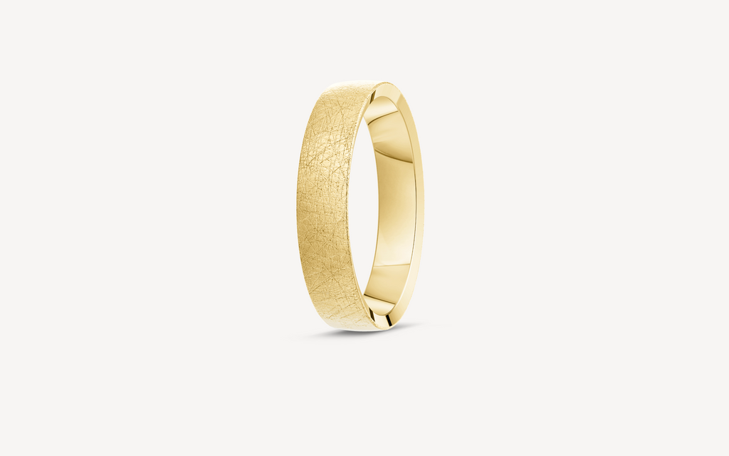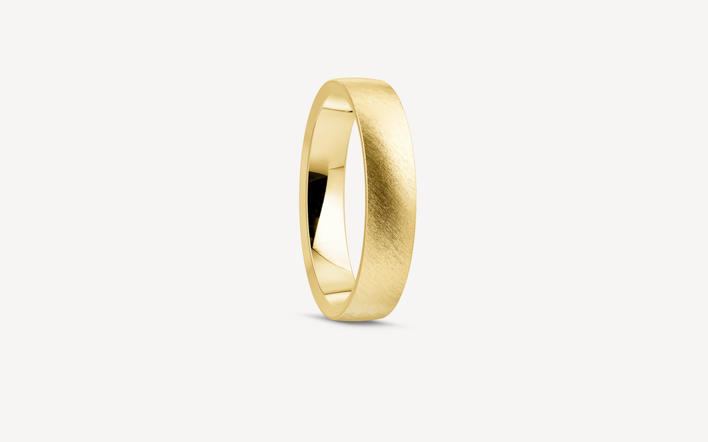 14kt guldring, 5mm bred og 1,8mm høj. D-profilen har et fladt/firkantet design, der ligger behageligt på fingeren. Ringen har en indadgående fræset kant.